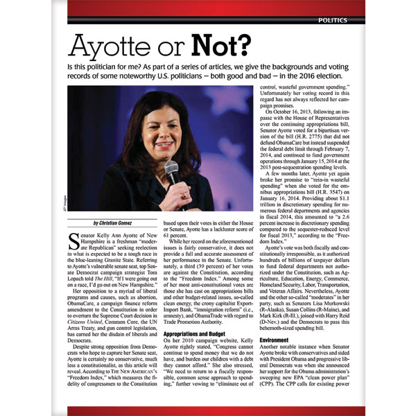 Senator Kelly Ayotte twice voted to empower President Obama with Trade Promotion Authority (TPA) in order to continue negotiations for the anti-sovereignty Trans-Pacific Partnership (TPP) and Transatlantic Trade and Investment Partnership (TTIP). (2016, 5pp).