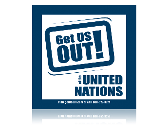 Influence others to get involved in the Get US Out! of the UN campaign with this window cling. (2012)