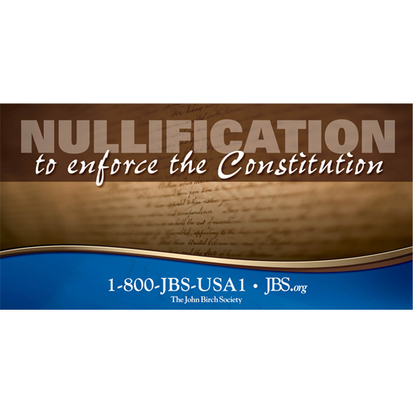 NULLIFICATION to enforce the Constitution. Includes 800 # & JBS website address. Constitution-looking background. (2014)