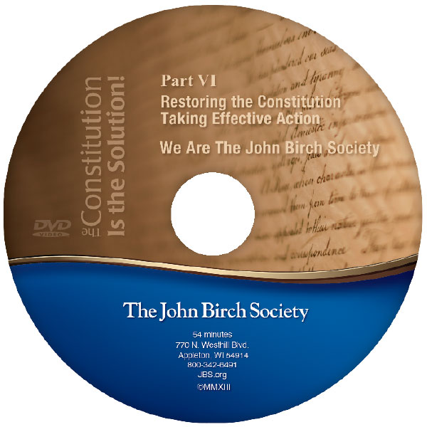 Part VI of the “Constitution is the Solution” DVD series. Includes “Restoring the Constitution,” “Taking Effective Action,” and “We are the John Birch Society.” (2013, 54 min, DVD)