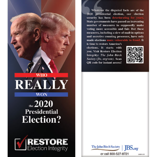 Educate voters on how restoring election integrity starts with them. This slim jim provides the online address of The John Birch Society’s “Restore Election Integrity” action project along with a Smart code that can be scanned for instant access. (Sold in packs of 25, 2021)